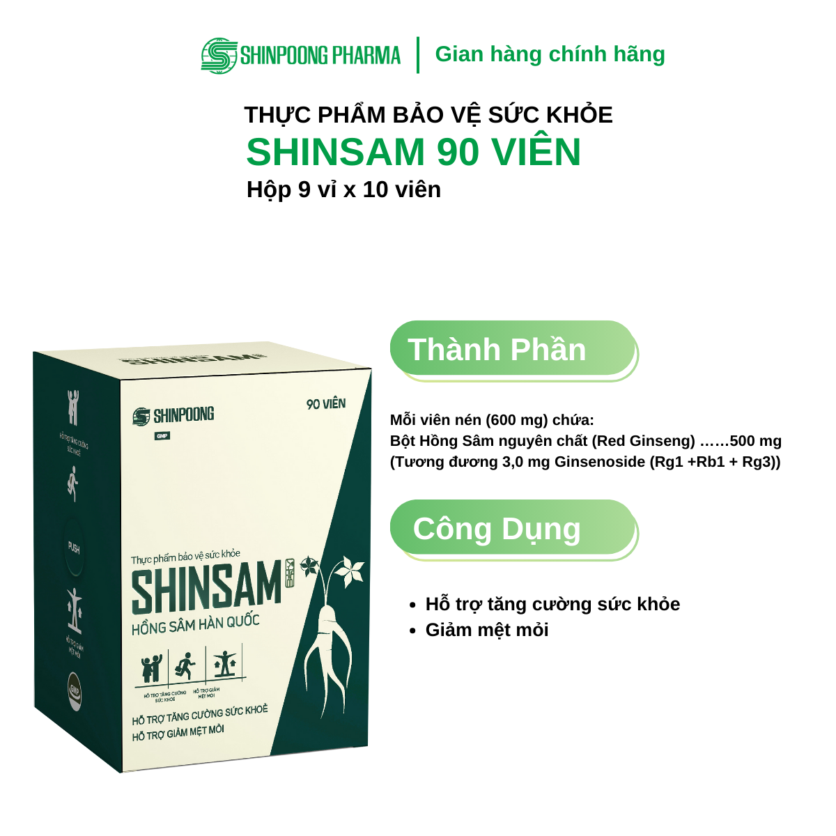 Mỗi viên nén (600 mg) chứa: + Bột Hồng Sâm nguyên chất (Red Ginseng) ……500 mg (Tương đương 3,0 mg Ginsenoside (Rg1 +Rb1 + Rg3)) | |